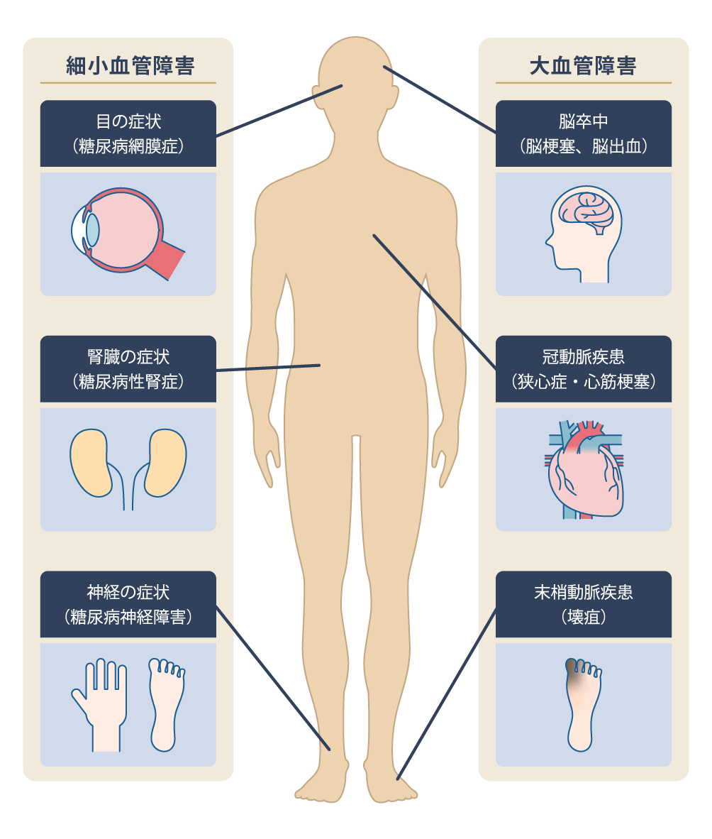 慢性的な高血糖状態が続くと、血管がダメージを受け、合併症が進行していきます。血管は全身に張り巡らされているので、目に見えないほど細い血管から比較的太い血管まで様々な臓器に障害が起こる可能性があります。今症状がなくても数年から数十年かけて血管のダメージは進行していきます。糖尿病は、軽度の高血糖では症状が出にくいことから知らぬ間に合併症の発症・進行が起こります。そのため、無症状でも糖尿病と診断された段階で検査・治療を行い、血糖コントロールをしていく必要があります。同時に高血圧、脂質のコントロールも合併症進行を予防するために重要です。