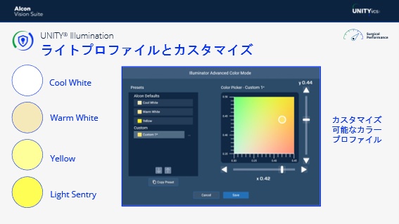 光源もRGB LED光源を採用しており、長時間の光量一定化(最大10,000時間)を可能としています。患者様の安全性を高めるために無水晶体眼の危険基準に準拠し、出力色を調整して青色光と緑色光の量を軽減するUNITY® light sentry安全モードが搭載されています。網膜組織への光毒性および光熱損傷の可能性を低減させます。