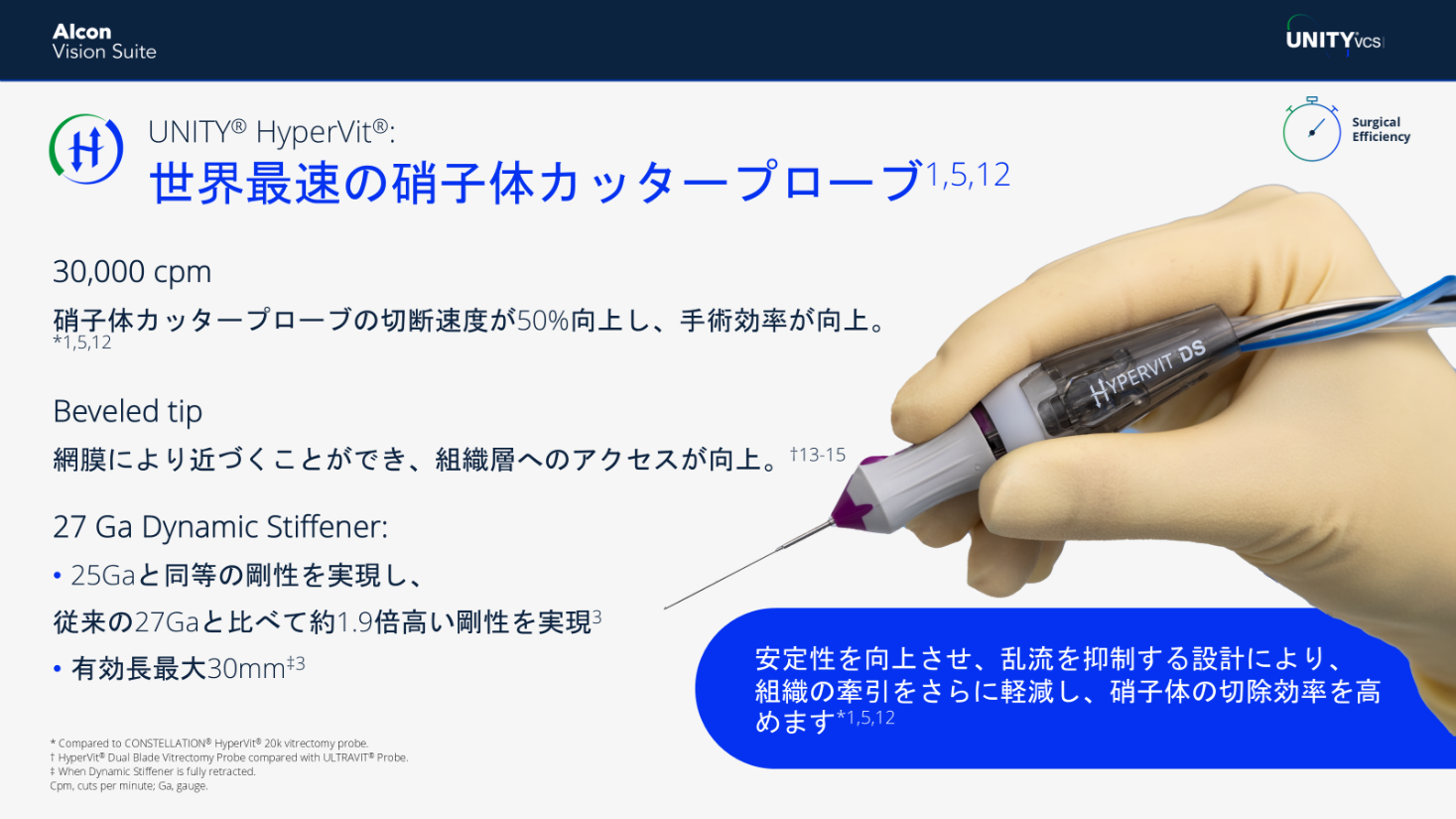 高い効率で安全に硝子体を切除することが可能で、手術時間の短縮と医原性の網膜裂孔形成など合併症の大幅な軽減につながります。