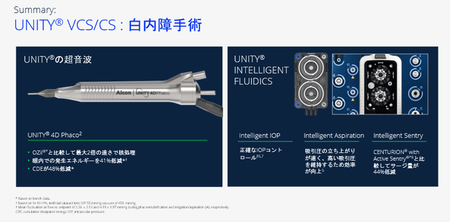 UNITY® VCSは1台で白内障手術、硝子体手術の両方を行うことが可能な統合型の手術機器となります。