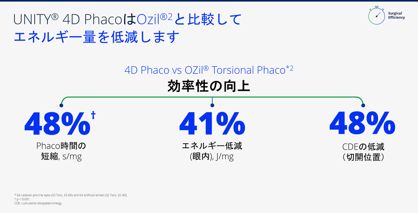 水晶体を破砕するために超音波をかける時間を48%短縮し、エネルギー消費を41%低減させます。これにより、手術時間の短縮やエネルギー消費量の軽減による組織損傷のリスクが抑えられます。