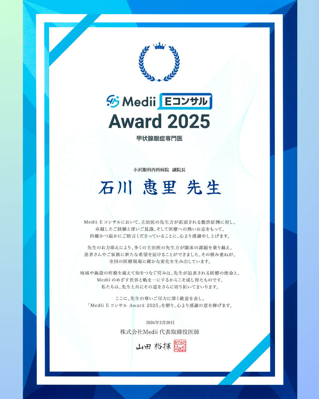 2026.02.28石川恵里先生「Medii Eコンサル Award 2025」 を受賞